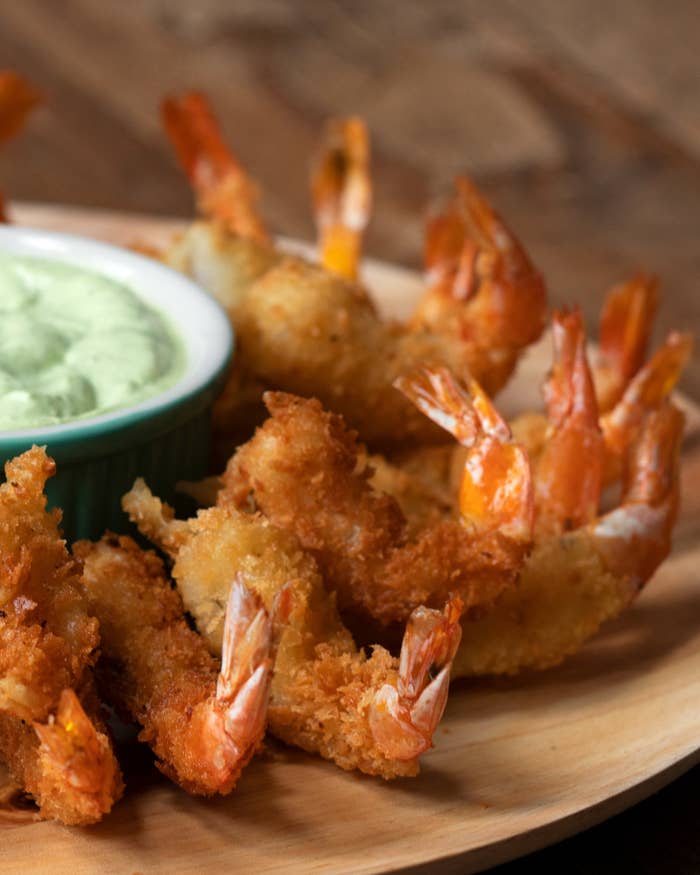Sirva o camarão crocante com o molho de ervas.